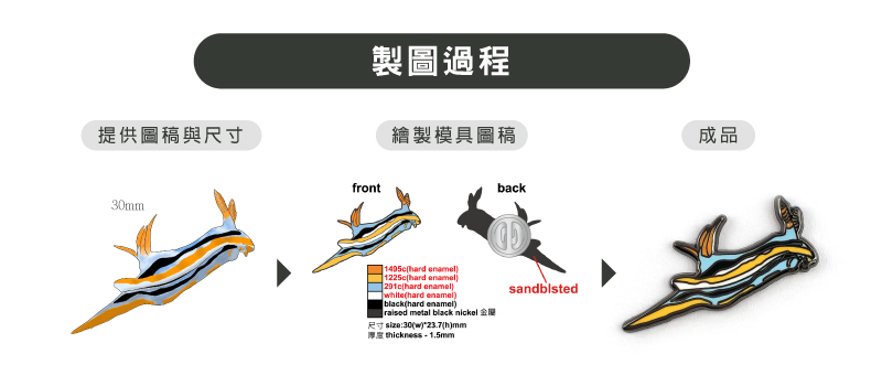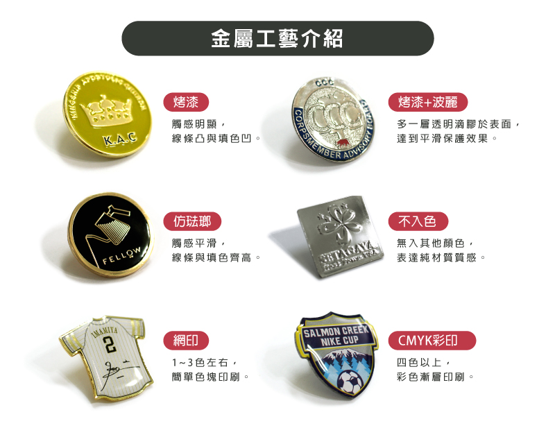 以不銹鐵材質為底,將圖稿滿版印刷在金屬表面,並加上波麗滴膠保護,適合印製漸層、手繪等複雜效果,重量也較為輕盈,適用動漫周邊、各種活動場合。