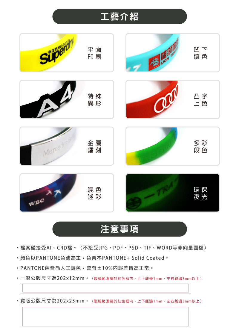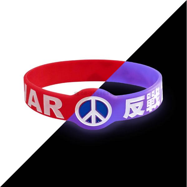 手環加入夜光粉,吸光後可於暗處發綠/藍光,可搭配印刷、凹下、凸起等工藝,客製專屬夜光手環,於展場、活動、路跑、演唱會...等等宣傳廣告皆適用。