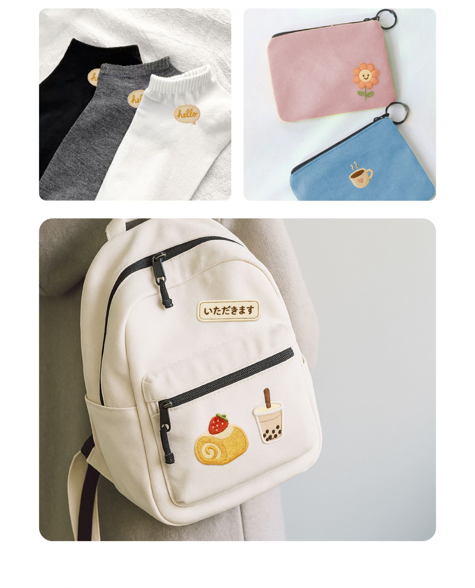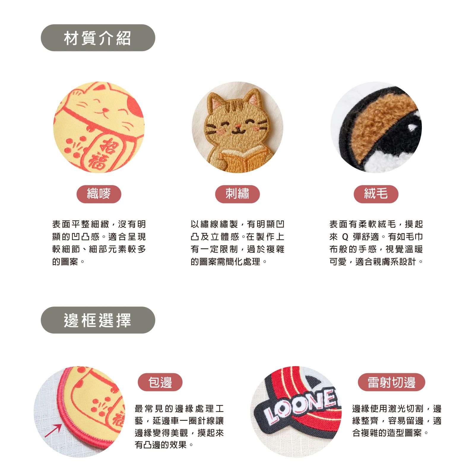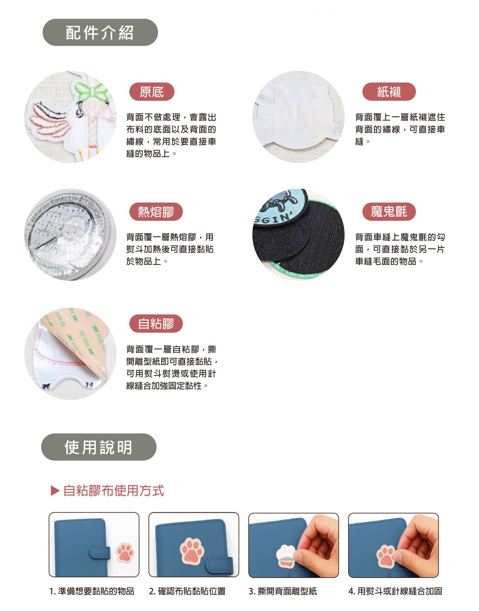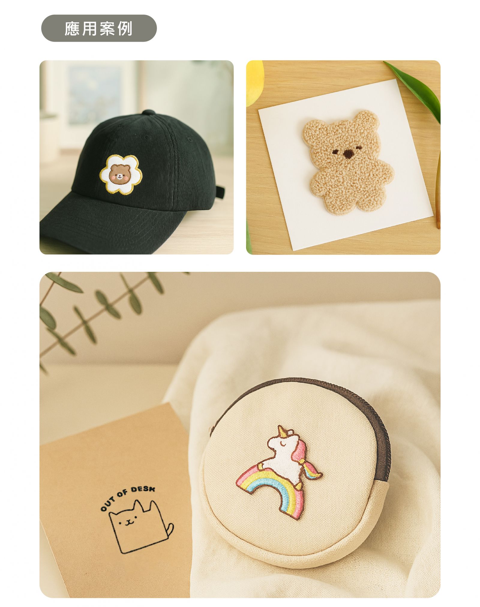 刺繡布貼可用車縫或是用熨斗熨燙方式將刺繡布章加工於帽子、零錢包、衣物、帆布包等產品或是做成臂章,可依需求挑選喜歡的工藝跟配件。