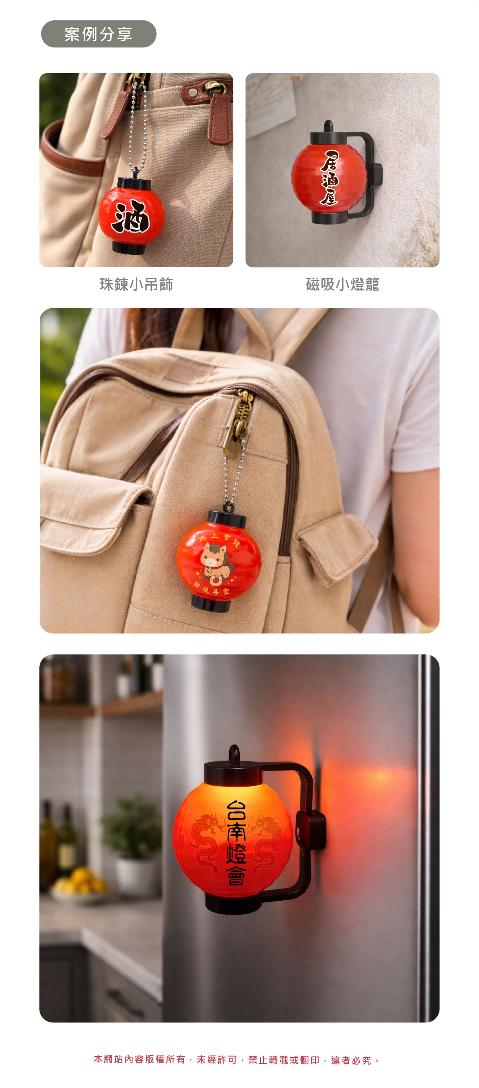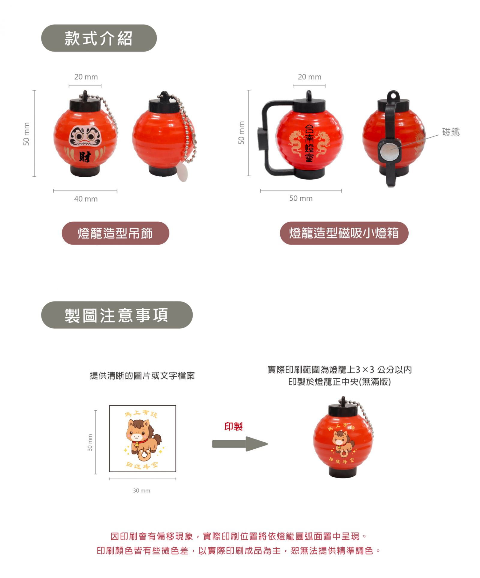小燈籠造型吊飾支援高解析度彩色印刷,細緻呈現品牌LOGO、客製圖案,適合企業禮贈、廟宇文創、活動紀念品批量訂製。
