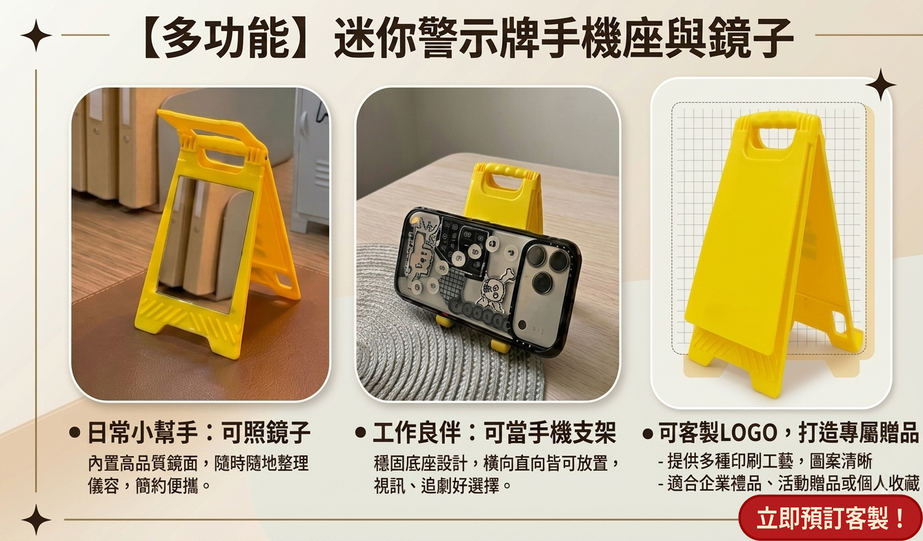 警示牌手機支架除了可以當裝飾放桌面,也可以拿來當手機支架使用,橫向直向皆可放置,還有鏡子功能,掀開後可當鏡子使用,可以印製LOGO。